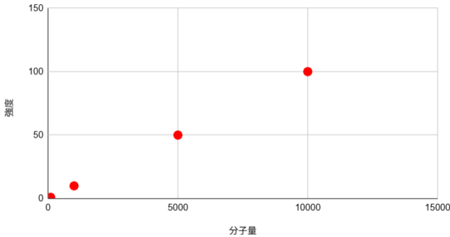 上記のプロット図から、分子量と強度には比例関係があることが一目でわかります。数式で表すとy = ax (y:強度、x:分子量)になります。